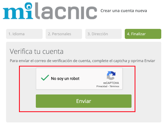 - After entering your personal data, go to 4. Finalizar, check the Captcha, and click "Enviar":
