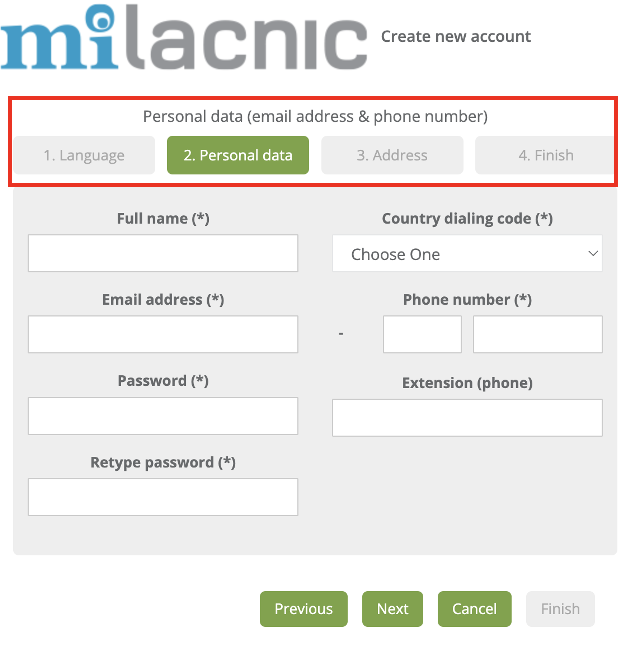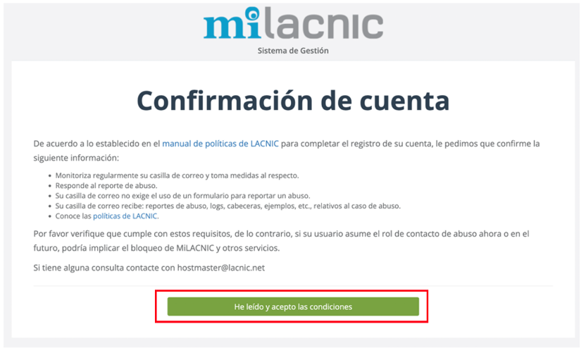 The first step is to create a user account in MiLACNIC. To do so, go to: https://milacnic.lacnic.net/lacnic/login