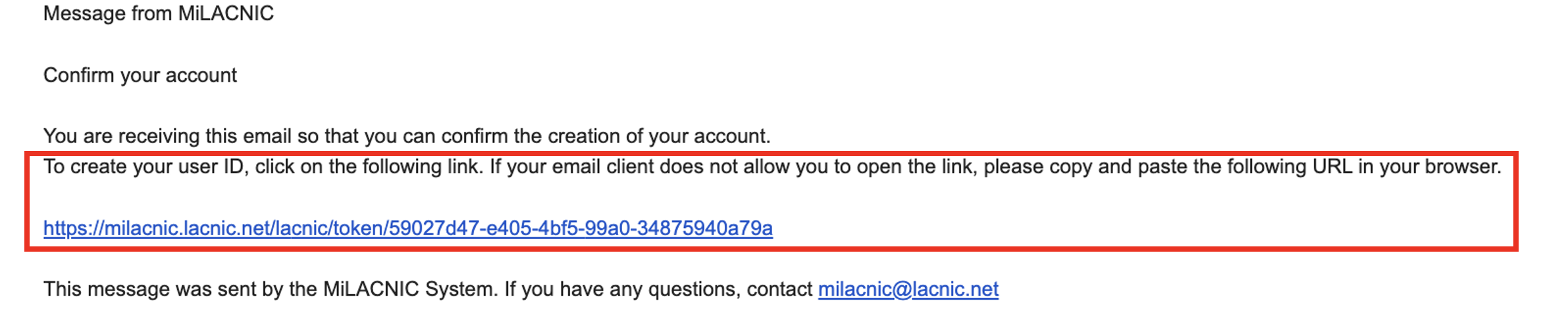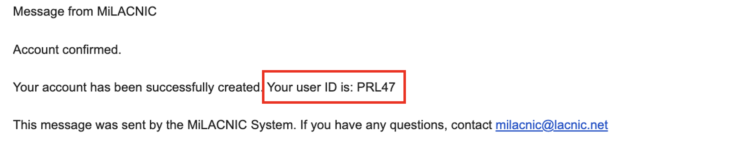 - Finally, a message will be sent to the email address you registered containing your User ID, which you can use to access MiLACNIC: