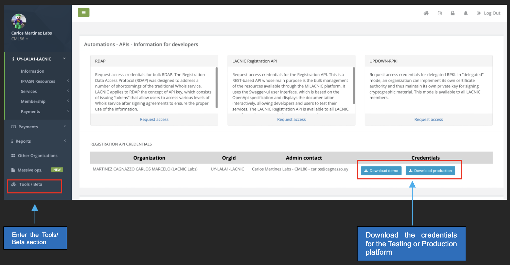 You will be able to access the credentials through the MiLACNIC platform, in the Tools/Beta section of the menu.
