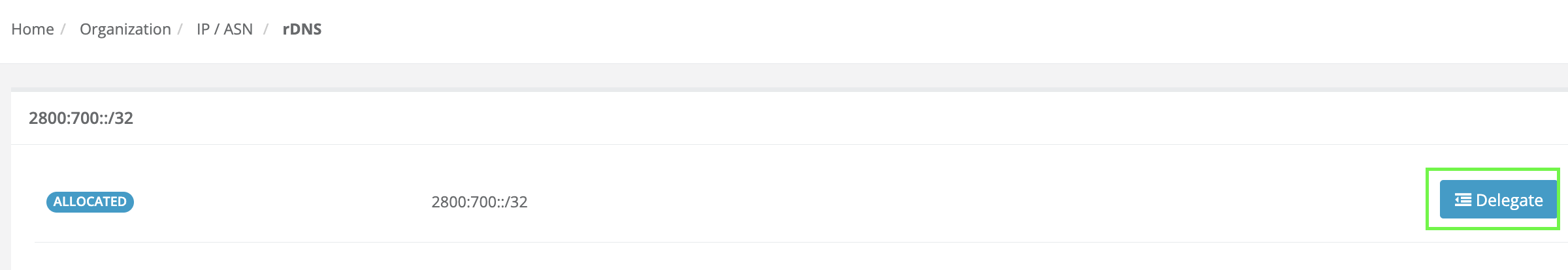 - [Delegate]: This action begins the process of reverse DNS delegation for the selected IP address block.
