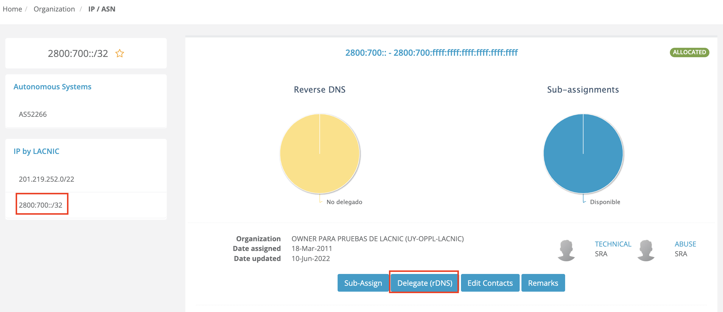 In this section you may begin the process of reverse DNS delegation for the selected IP address block. The list shows all the IP address blocks allocated to the organization you manage. Depending on their status, each block will have different options.