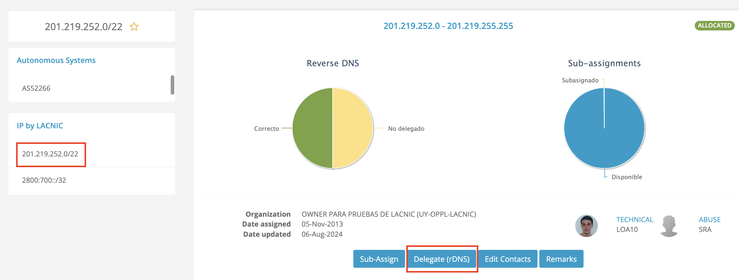 - [Edit]: Allows initiating the process of editing the current rDNS delegation.
