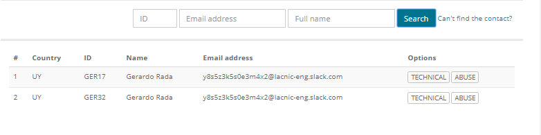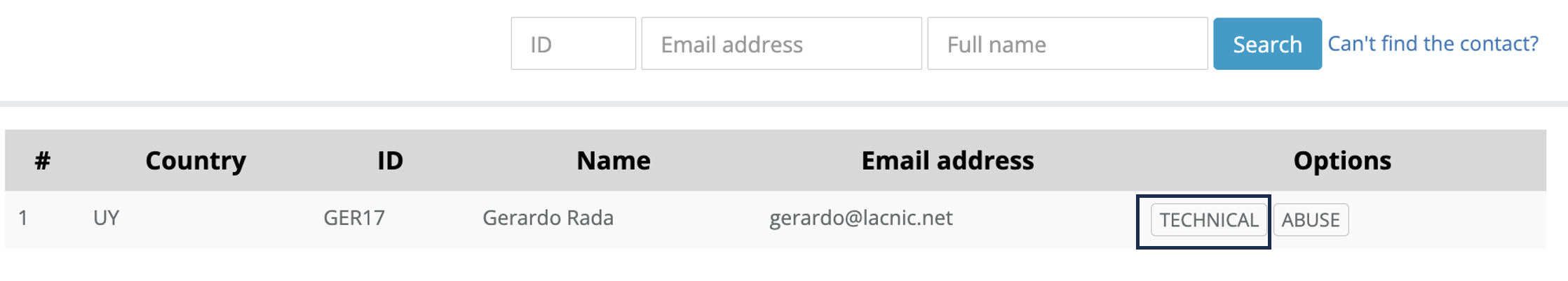 - The search will return a list of all the contacts/users you can assign as the new TECHNICAL or ABUSE contacts for the ASN you are editing.