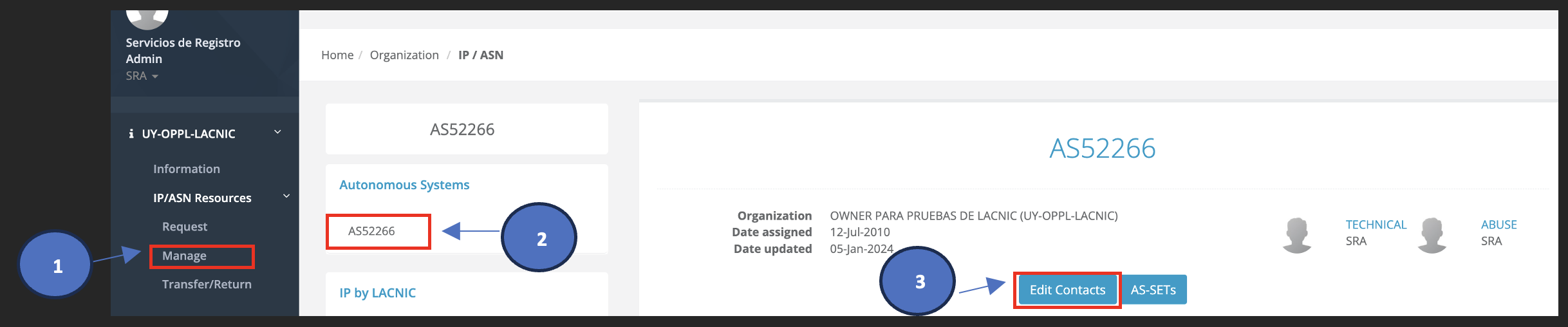 Process for editing the TECHNICAL and ABUSE contacts for an ASN:
