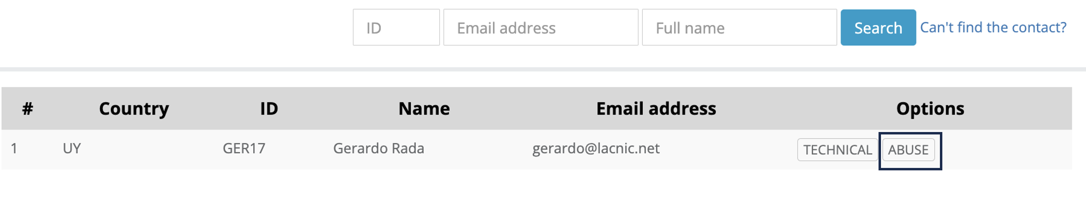 - To edit the Abuse contact, from the list select the [ABUSE] button for the contact you wish to assign. You can repeat this process, selecting a different contact/user until you are happy with your choice.