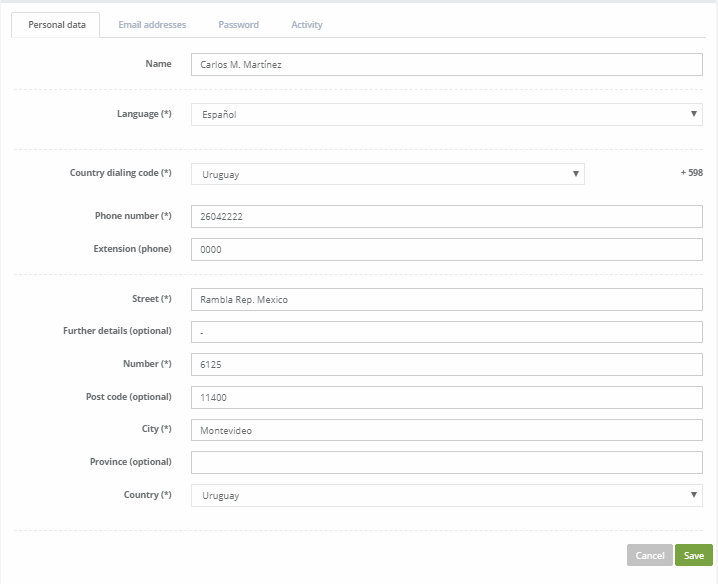 Click on the [Personal data] tab to edit the user's personal information, as well as to select the main language in which the account will be displayed.