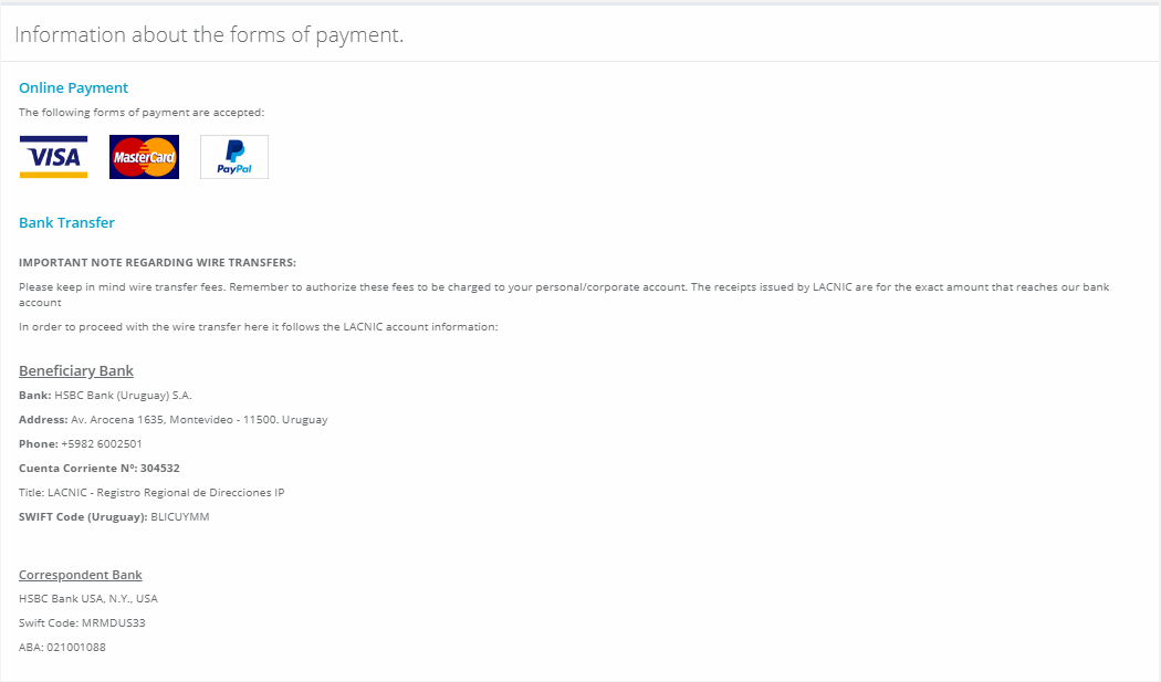 IMPORTANT NOTE REGARDING BANK TRANSFERS: Please keep in mind that transfer fees may apply. Remember to authorize these fees to be charged to your account. The receipts issued by LACNIC are for the exact amount received in our bank account