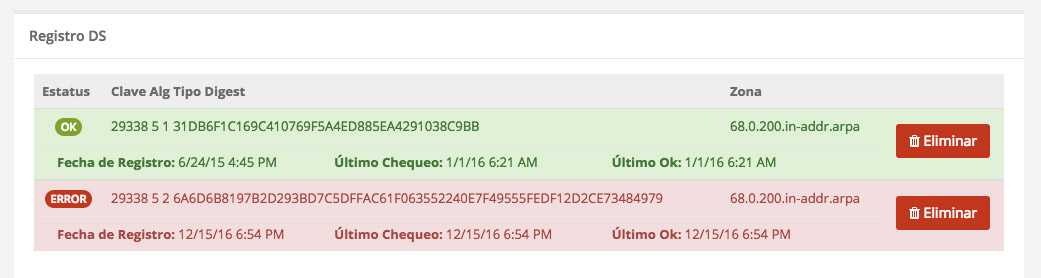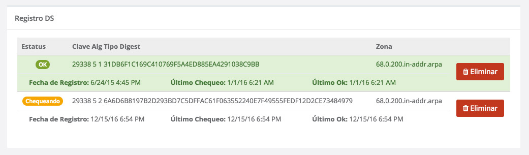 Once you've created your DS Record, Mi LACNIC will display their status.
