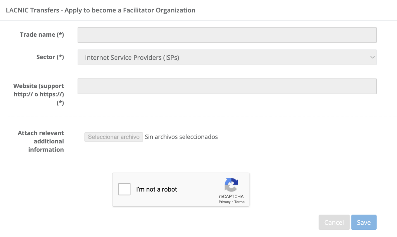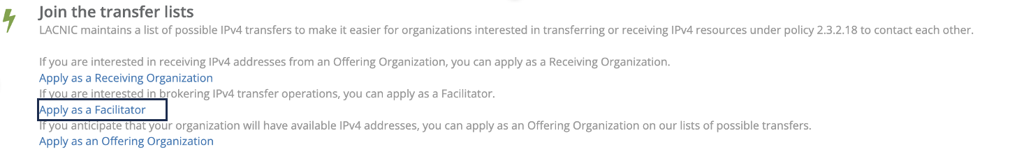 Under Participate in the transfer lists, click [Apply as a Facilitator Organization].