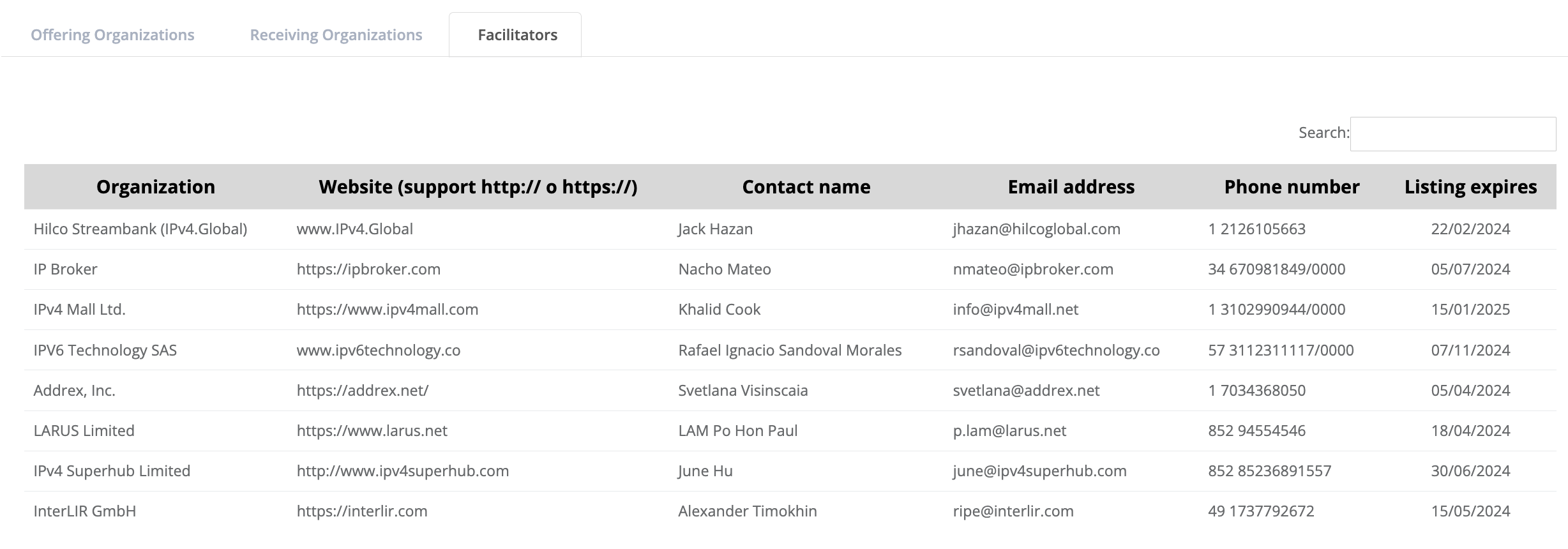 - In the Facilitators section, the listing option shows a list of the intermediary organizations available: