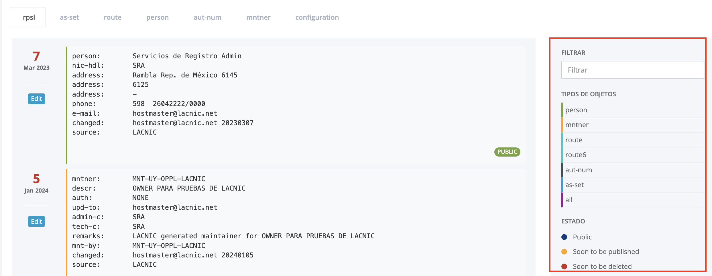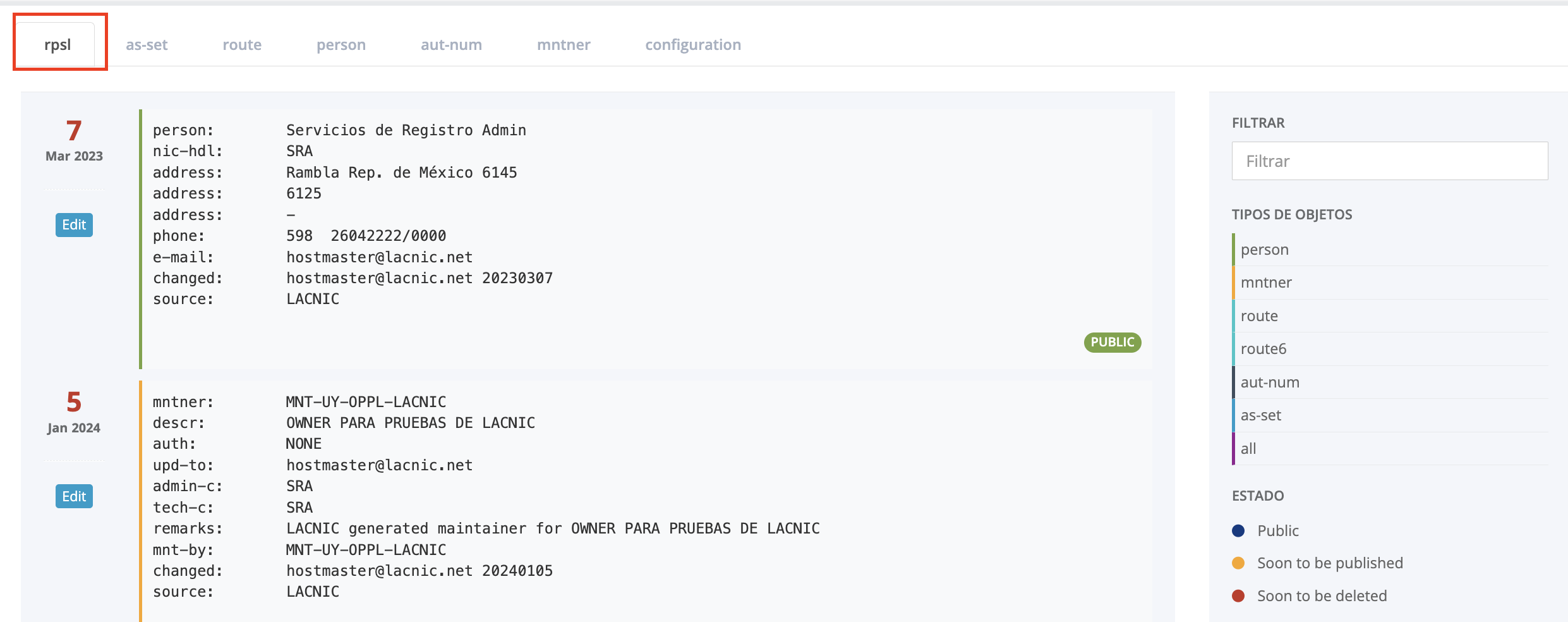 Note: Each object has a tag on the bottom right that specifies whether the object can be queried via the public interfaces of the LACNIC IRR (ftp files, whois at irr.lacnic.net, other web query interfaces).