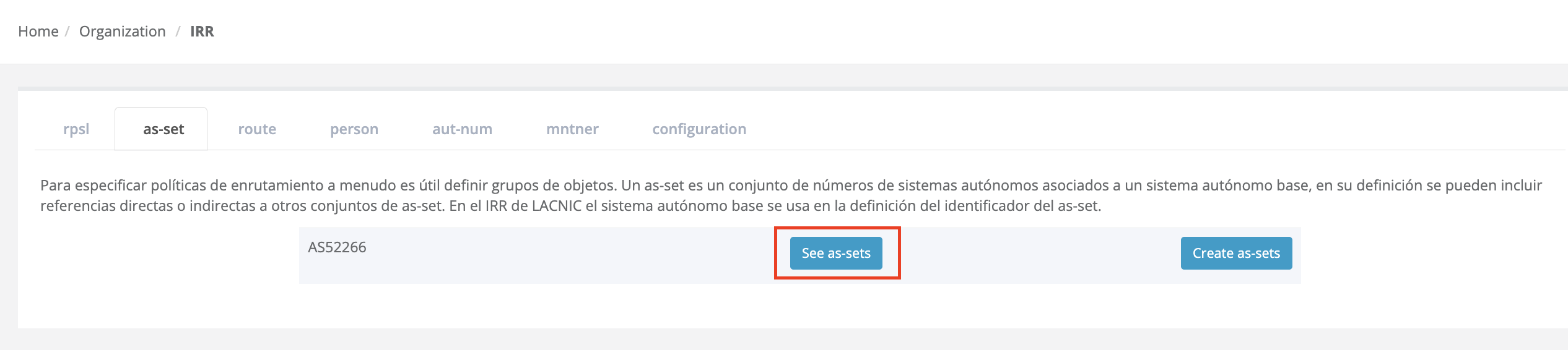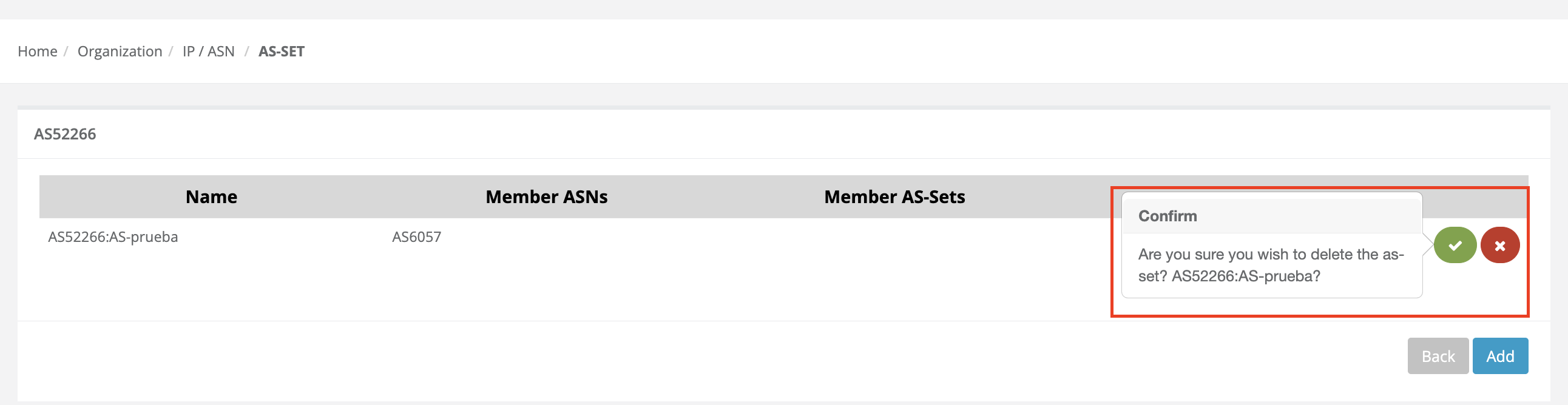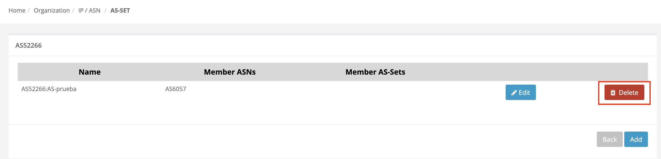 To delete an as-set, go to the as-set list and select the [Delete] button of the as-set you wish to delete.