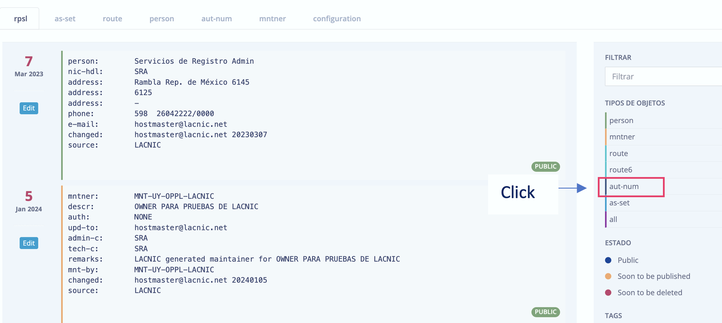 The [rpsl] tab shows a list of all the IRR objects. You can search for the aut-num object you wish to modify in the panel on the right by filtering by type of object or by label.