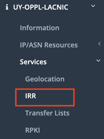 The [Services / IRR] option in the organization's context menu will allow you to access the panel where you can create as-set objects.