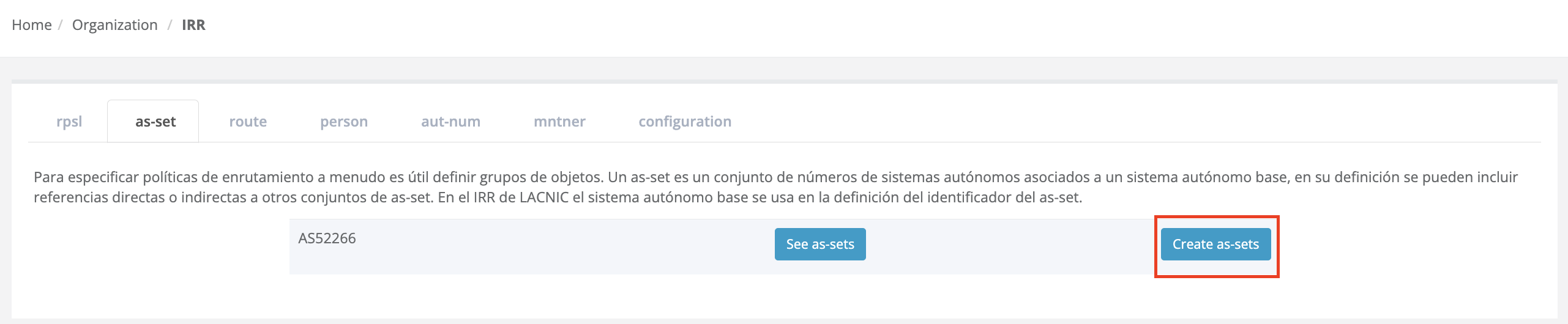 *Note: The name of the as-set object must be a unique text comprised of the name of the AS plus a description preceded by AS-. Example: AS28000:AS-DESCRIPTION.