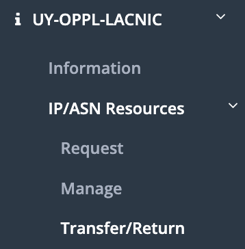 The [IP/ASN Resources] / [Transfer/Return] option in the context menu will allow you to access the section TRANSFERRING IPv4, IPv6 and/or ASN - TRANSFER LISTS.