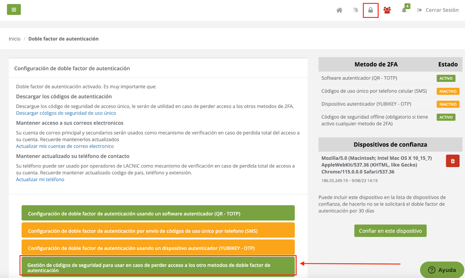 Para visualizar estos códigos se debe acceder a la sección 2FA de nuestro perfil (podemos acceder desde nuestro perfil o desde el ícono del candado en la parte superior derecha de la plataforma como se visualiza en la siguiente imagen). Una vez allí, se debe seleccionar la opción [Gestión de códigos de seguridad para usar en caso de perder acceso a los otros métodos de doble factor de autenticación]