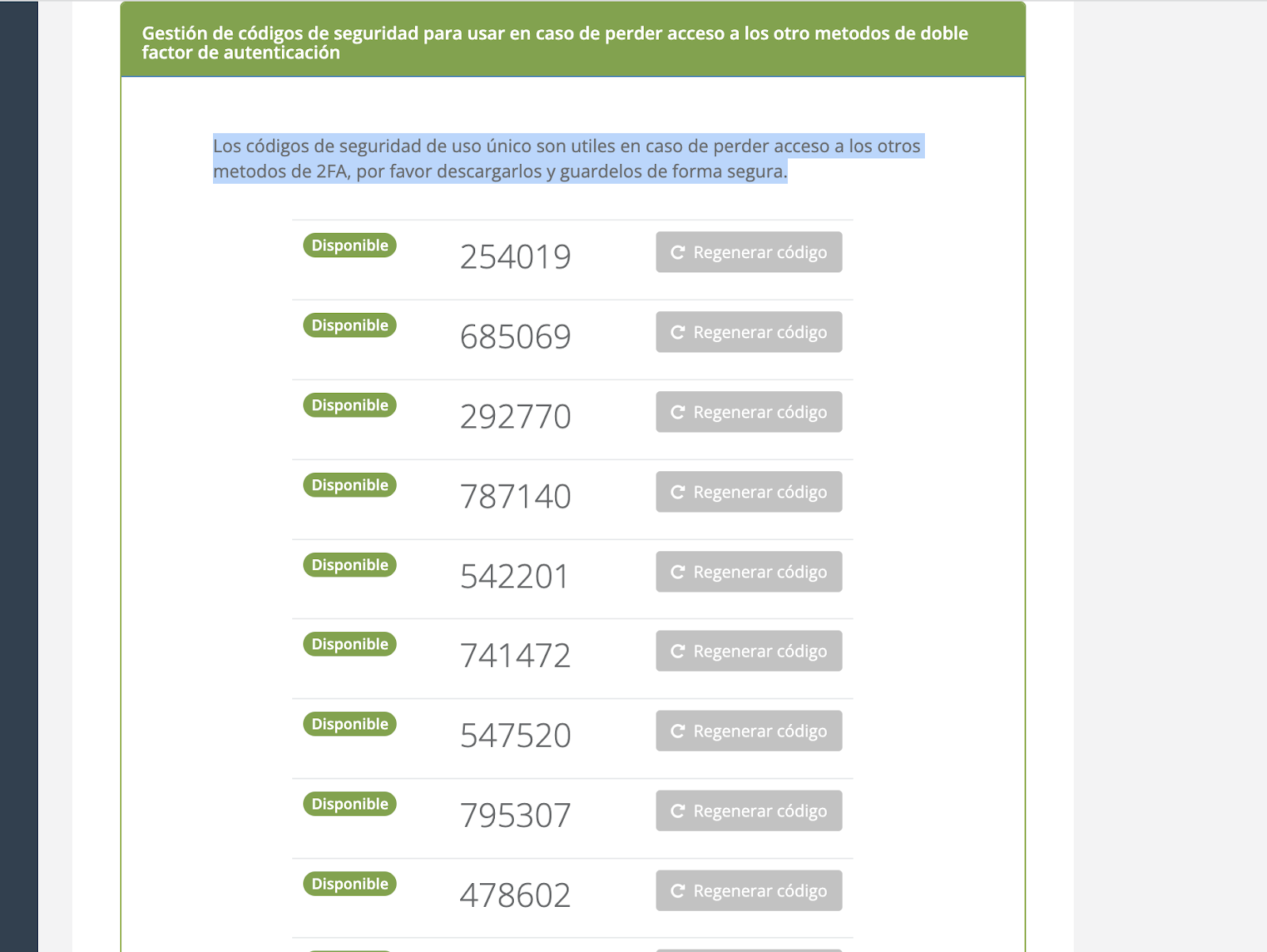 Se recomienda descargar y guardar en un ambiente seguro el archivo con los códigos disponibles.