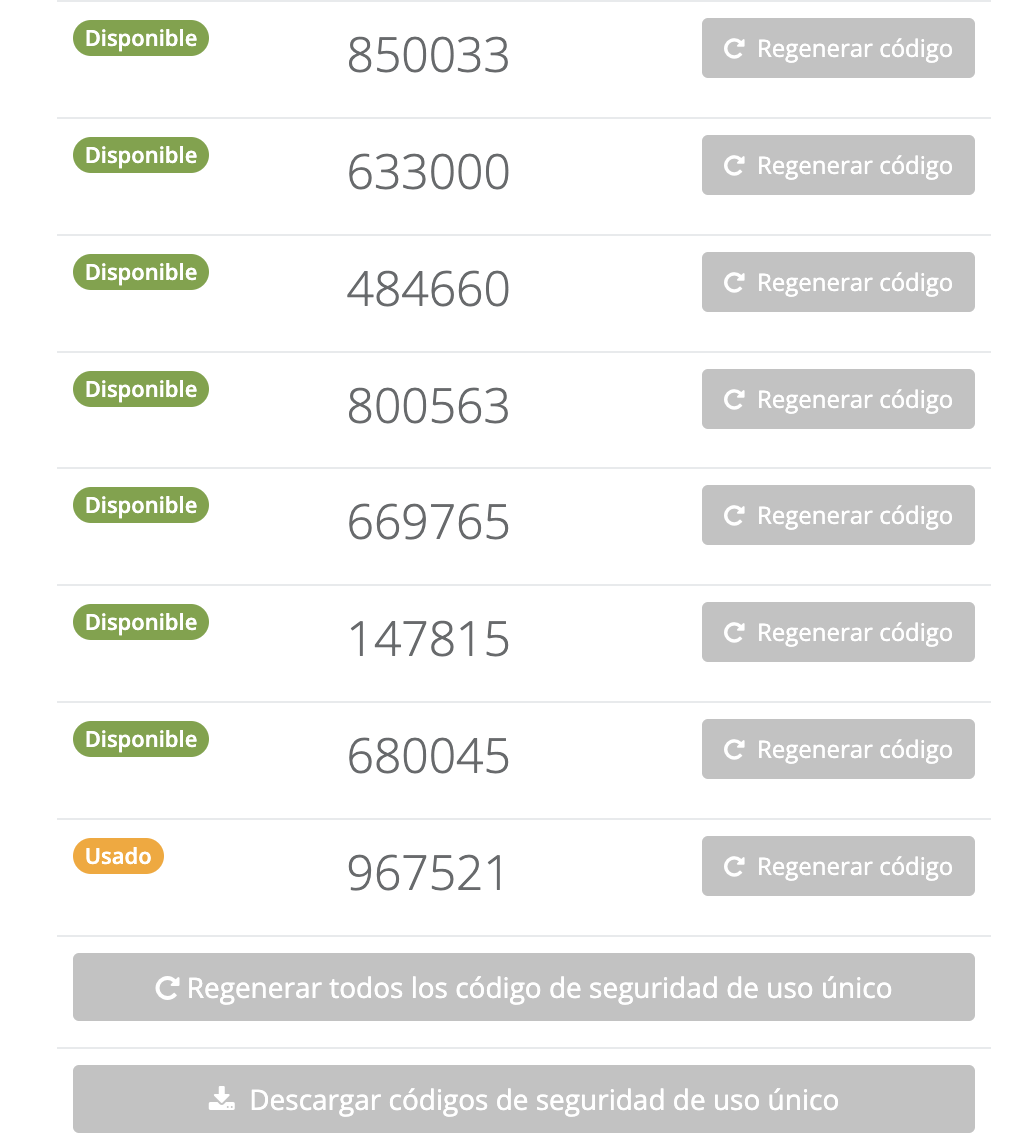 Dado que estos códigos solo pueden ser utilizados una única vez, luego de hacerlo será necesario que regeneremos el código para tener uno nuevo. Para hacerlo se deberá seleccionar la opción [Regenerar código]