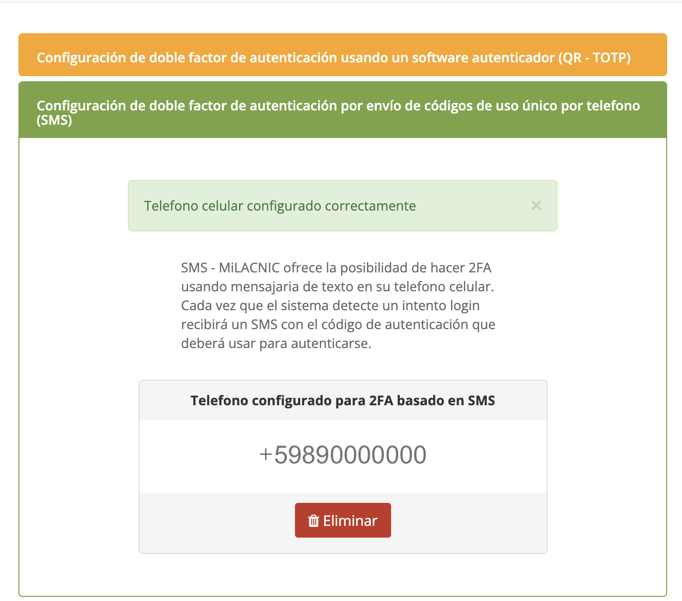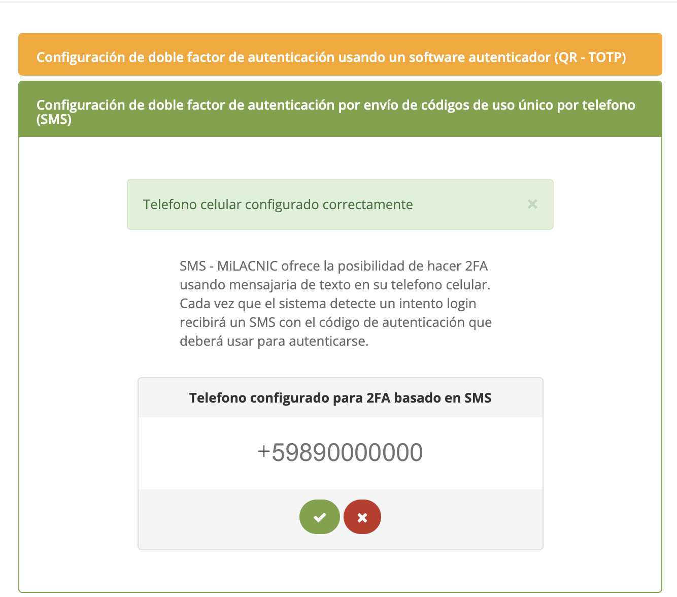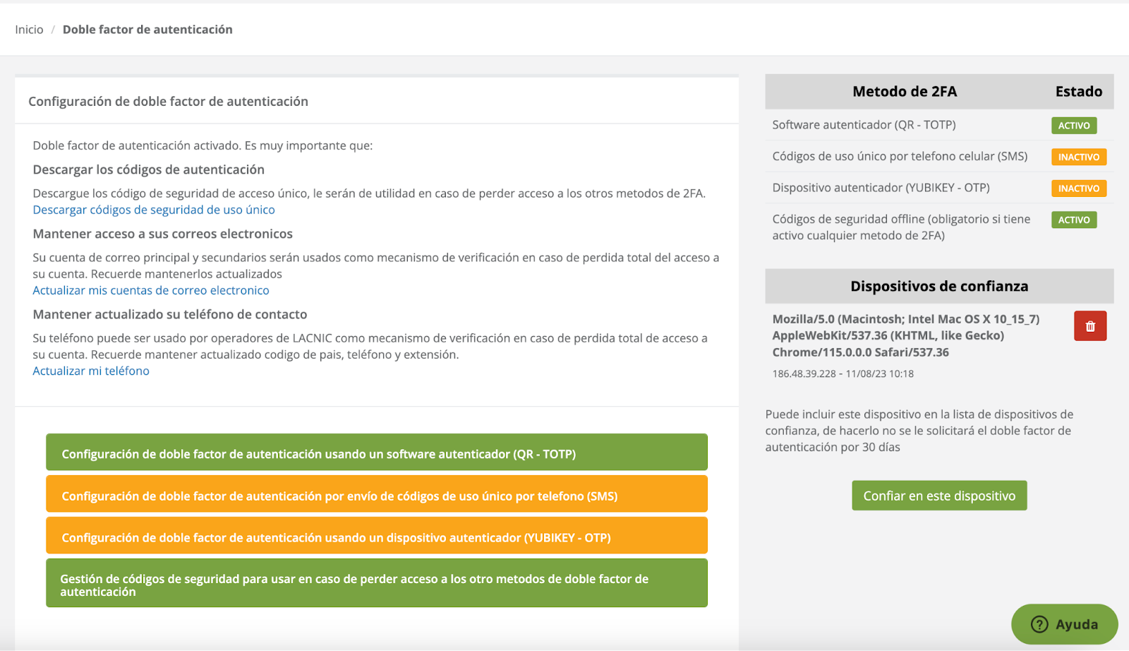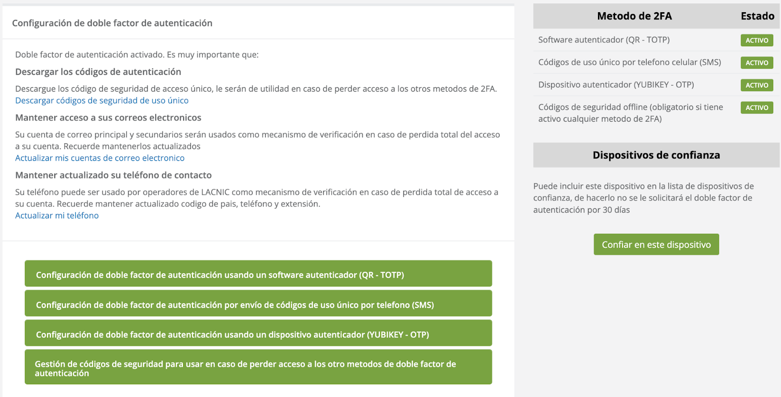 Una vez que tenemos el 2FA configurado, MILACNIC nos permite eliminar o añadir mecanismos de autenticación. Para hacerlo, en el panel del Doble Factor de autenticación se podrá visualizar los que tenemos configurados (verde) y los que aún no y podemos añadir (amarillo).