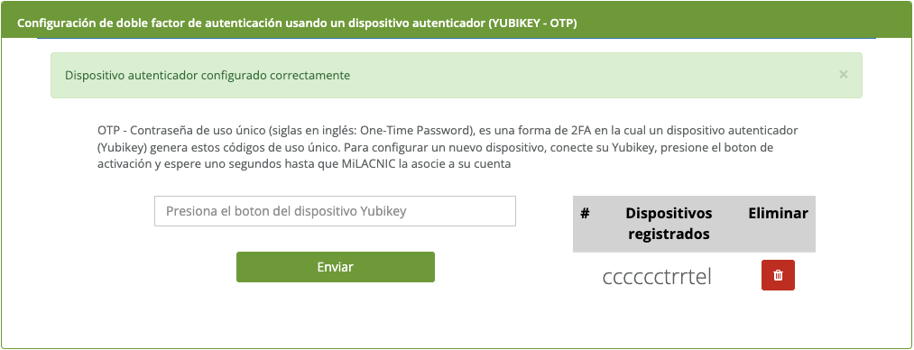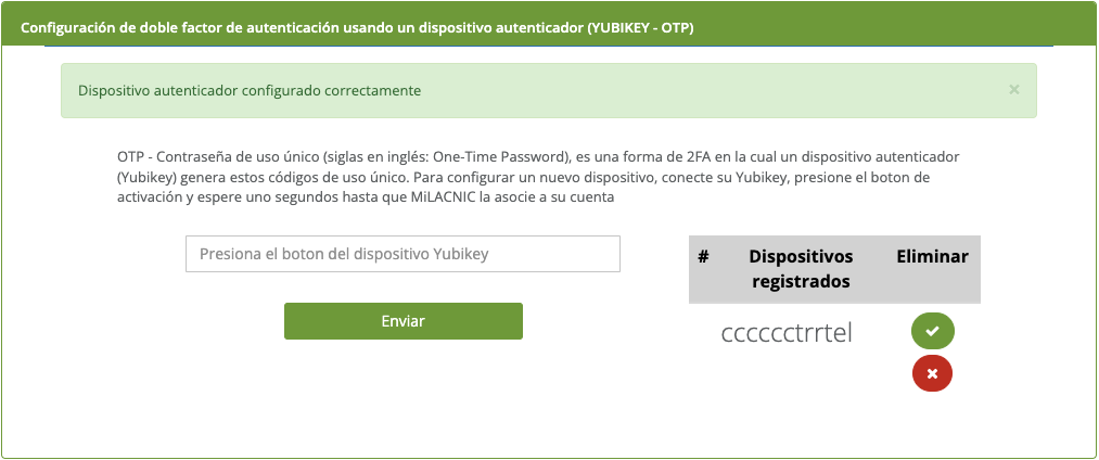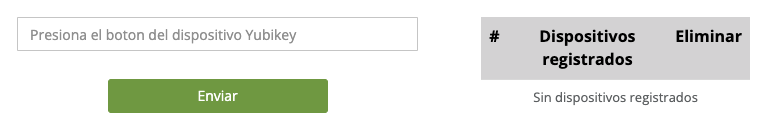 - Presionar el botón del dispositivo YUBIKEY, automáticamente reconoce el código enviado por el dispositivo y al seleccionar [Enviar] registra el método de autenticación correspondiente.