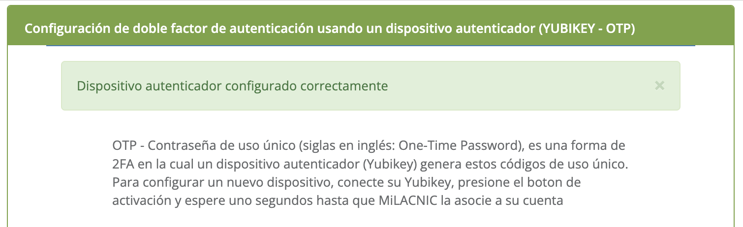 - Se visualizará el mensaje de que el dispositivo fue configurado correctamente y ya podrá utilizar su dispositivo YUBIKEY para realizar la autenticación de doble factor.