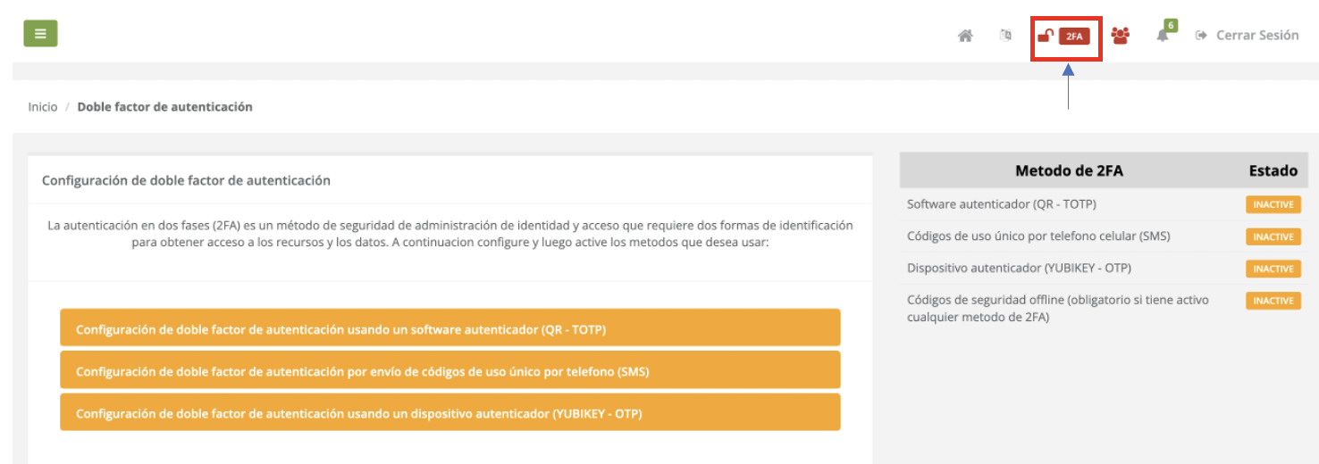 - Una vez ingresado quedará activo el 2FA (doble factor de autenticación) mediante SMS