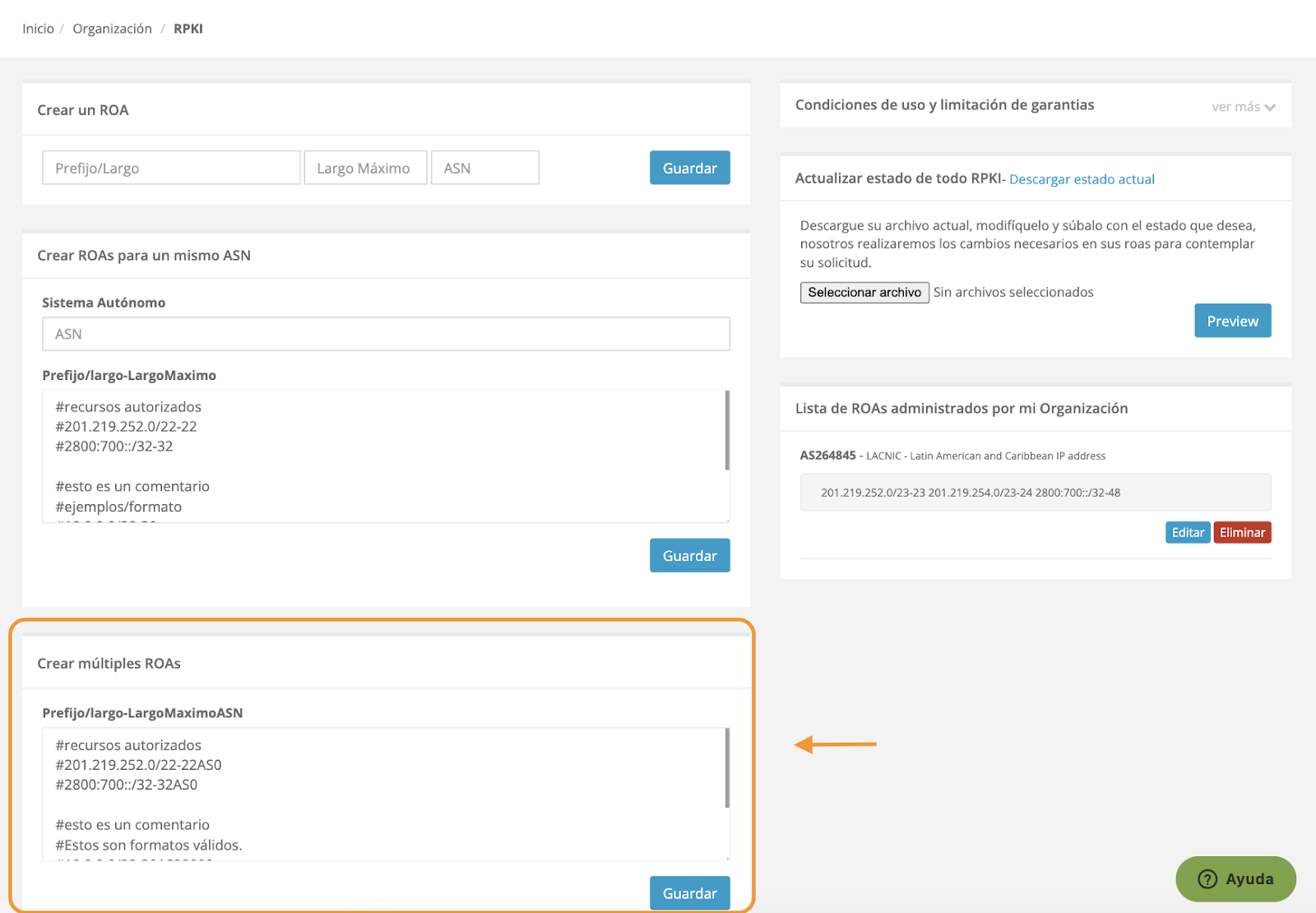 En la sección RPKI, encontrará la interfaz de creación de ROAs. Allí deberá ir a la sección de “Crear múltiples ROAs” ubicada en la parte inferior izquierda de la interfaz, donde podrá crear los ROAs correspondientes.