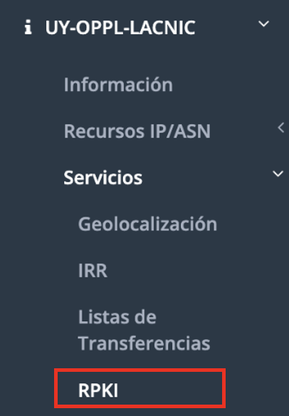 Desde el menú contextual de la organización deberá seleccionar la opción [Servicios] / [RPKI] y de allí se puede acceder a la sección para crear ROAs y administrar los detalles acerca de RPKI: