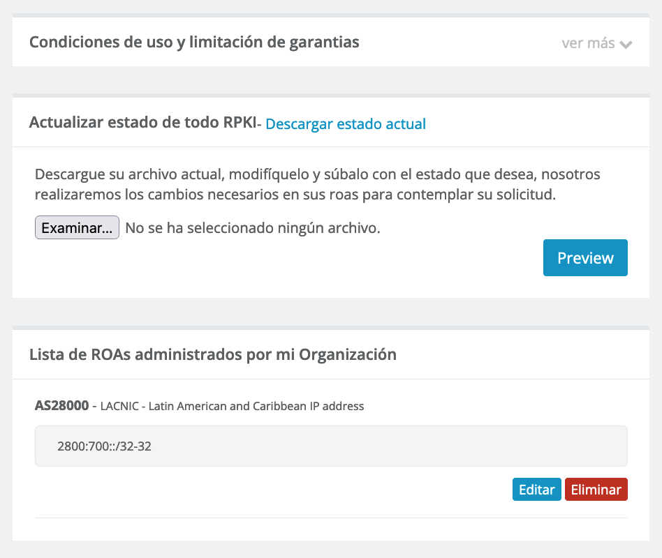 También encontrará el apartado “Lista de ROAs administrados por mi Organización” donde podrá ver, editar y/o eliminar los ROAs de su organización.