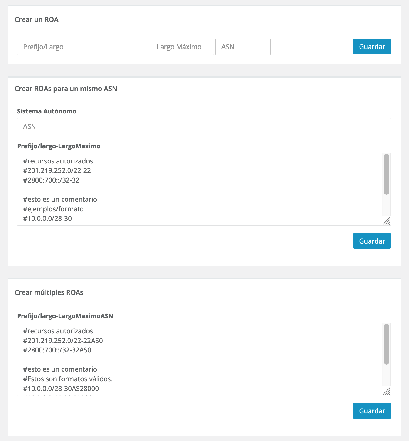 En la seccion RPKI, encontrará la interfaz de creación de ROAs, con tres método de ingreso que podrá utilizar para ingresar un único ROA o varios, [LINK ARTICULO Crear un ROA], [LINK ARTICULO Crear ROAs para un mismo ASN] y [LINK ARTICULO Crear múltiples ROAs]