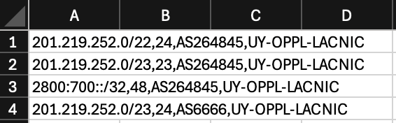 - Utilizando la fila 4 (201.219.252.0/23,24,AS6666,UY-OPPL-LACNIC) como ejemplo, se tiene que: