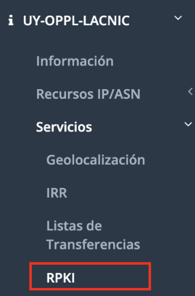Desde el menú contextual de la organización deberá seleccionar la opción [Servicios] / [RPKI] y de allí se puede acceder a la sección para crear ROAs y administrar los detalles acerca de RPKI.