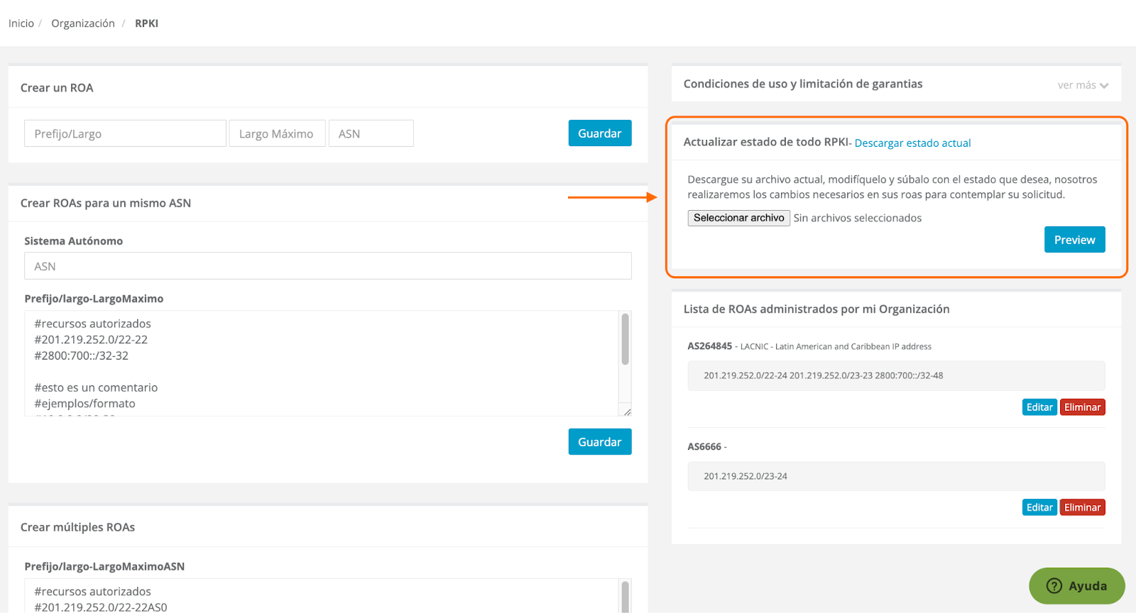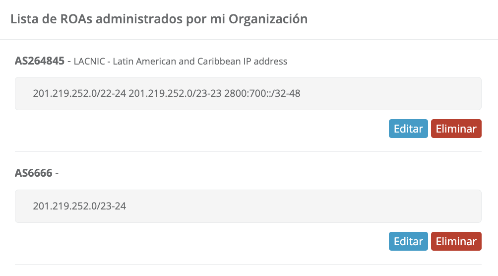 Evidenciando que los cambios fueron efectuados y también podrá visualizarlos en el menú contextual “Lista de ROAs administrados por mi Organización” ubicado a la derecha de la interfaz RPKI:
