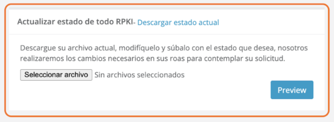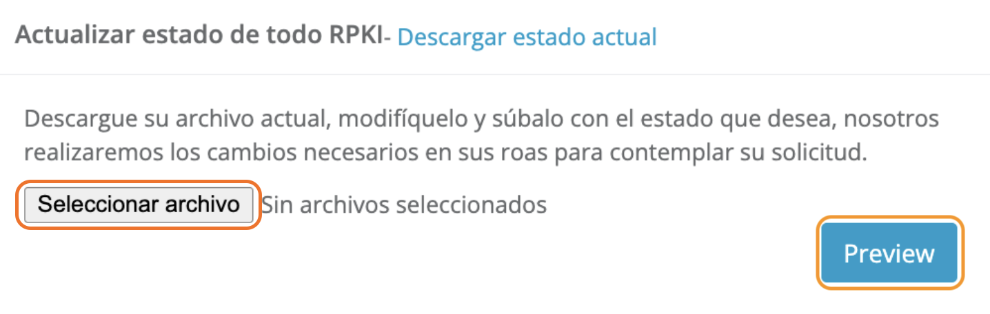 Una vez hechos los cambios (y guardando el .csv), volvemos a la interfaz de creación de ROAs y seleccionamos la opción de [Seleccionar archivo] y adjuntamos el archivo .csv modificado.