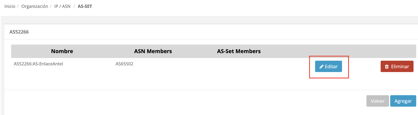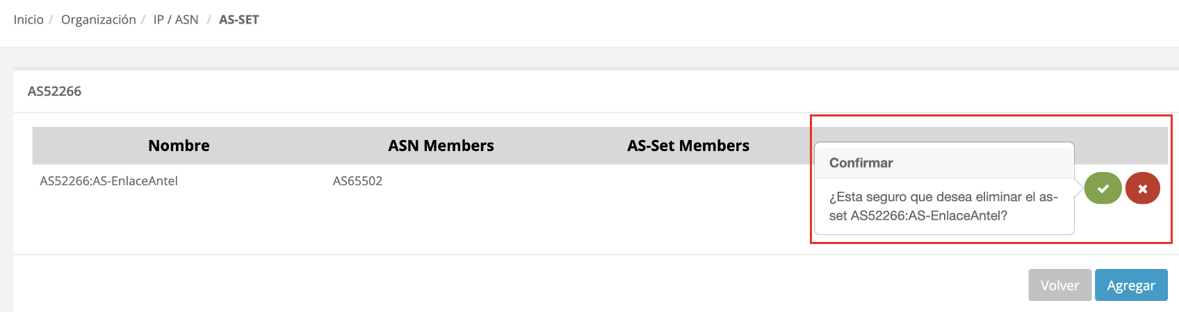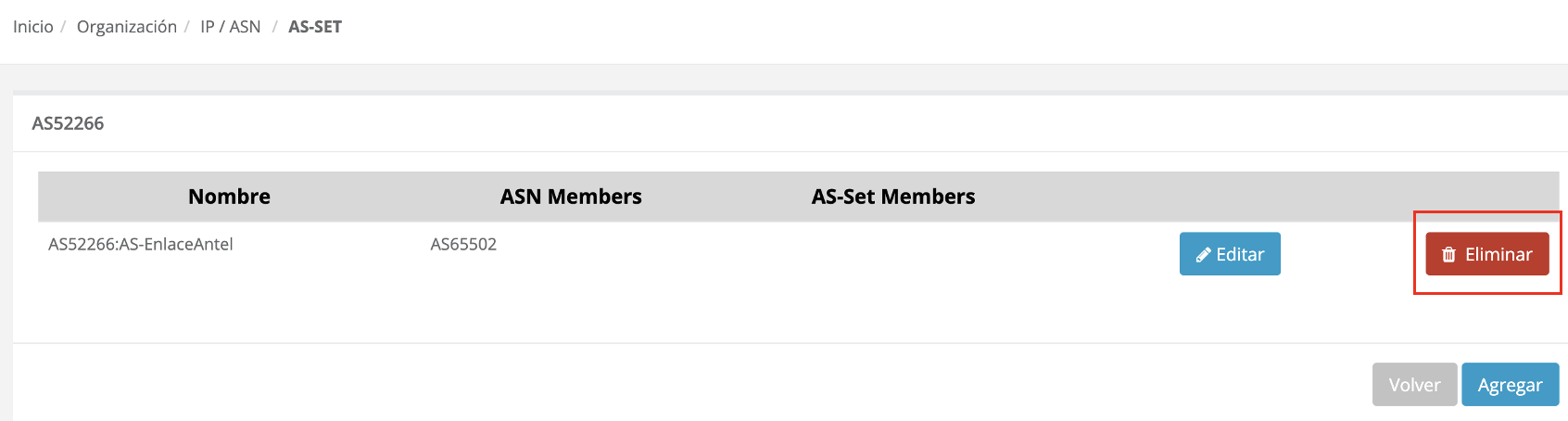 Para eliminar un as-set puedes acceder desde el listado de as-set, seleccionando el botón [Eliminar] del as-set que quieras eliminar: