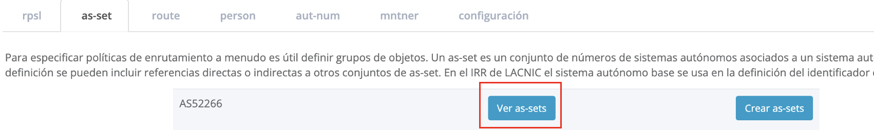 En la pestaña [as-set] seleccionar la opción [Ver as-sets] para que se muestre el listado de todos los objetos as-set: