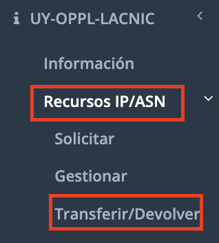 Luego en la sección TRANSFERIR IPv4, IPv6 y/o ASN - LISTAS DE TRANSFERENCIAS, seleccionar la opción: [Devolver recursos asignados por LACNIC].