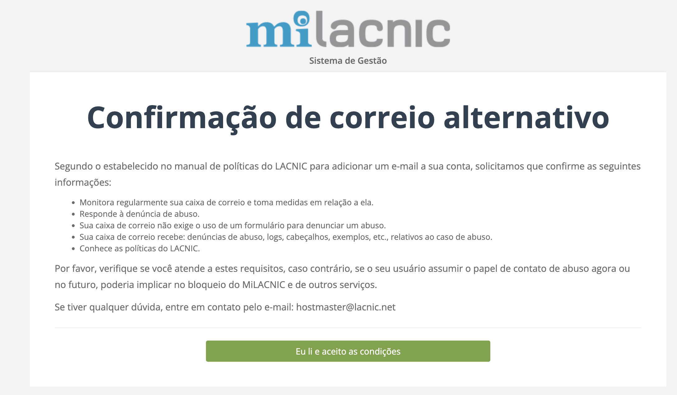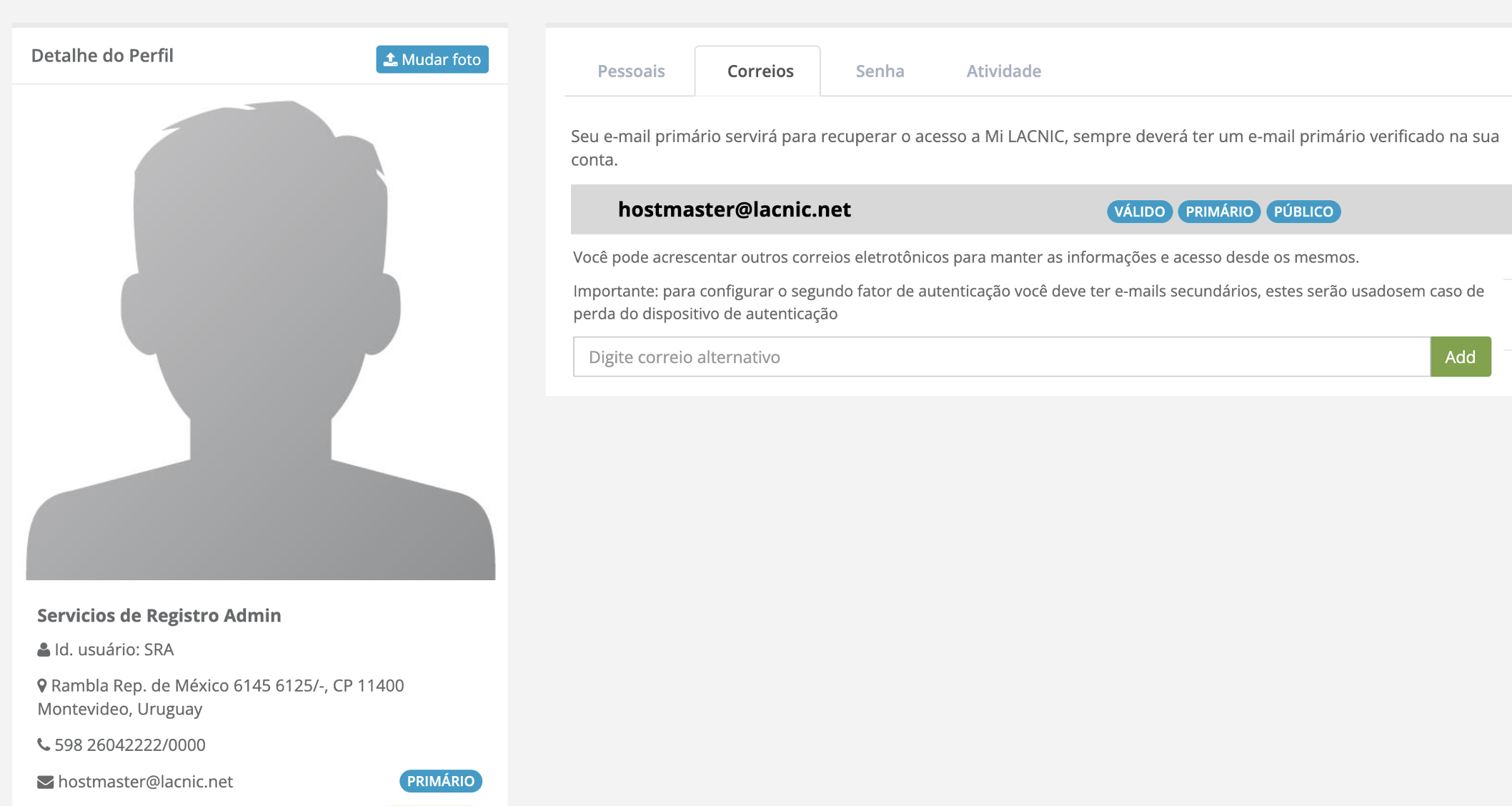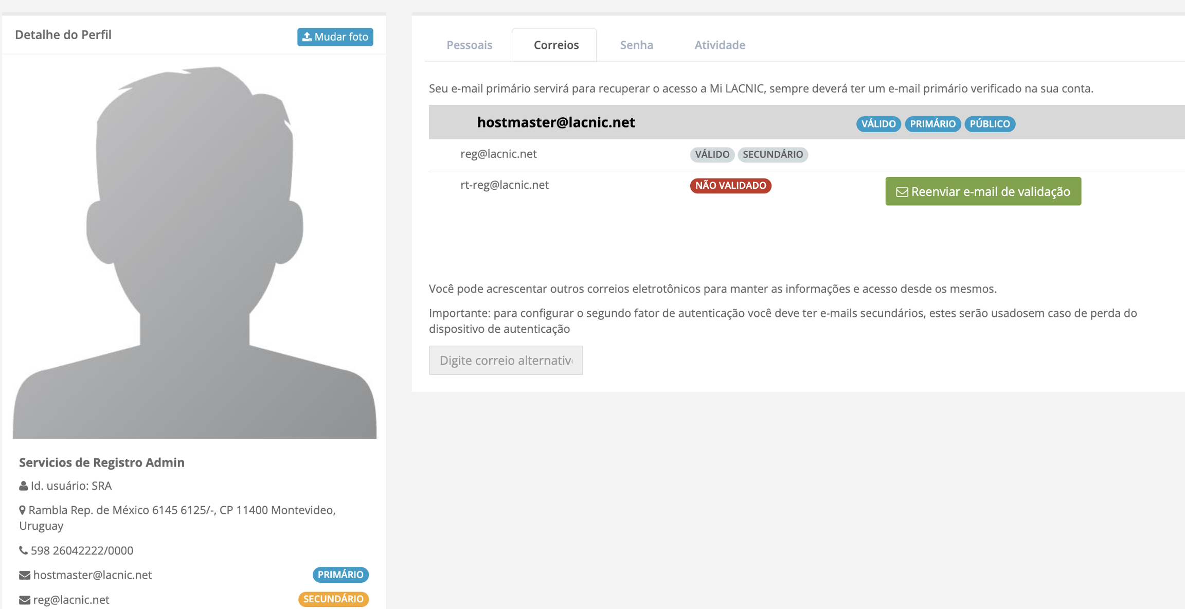 O LACNIC realiza um controle periódico dos correios principais associados a cada usuário, a fim de manter as informações de contato atualizadas e garantir uma comunicação eficaz com o usuário. Para contribuir com esse propósito, os usuários são incentivados a registrar um correio secundário.