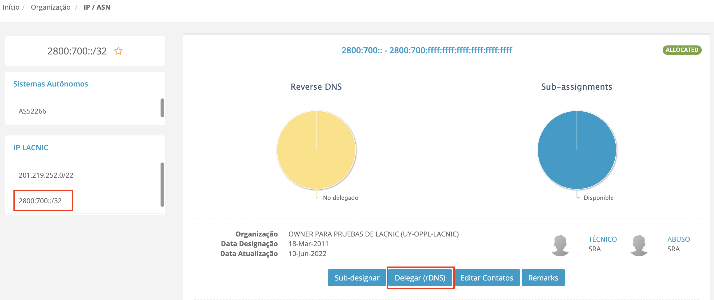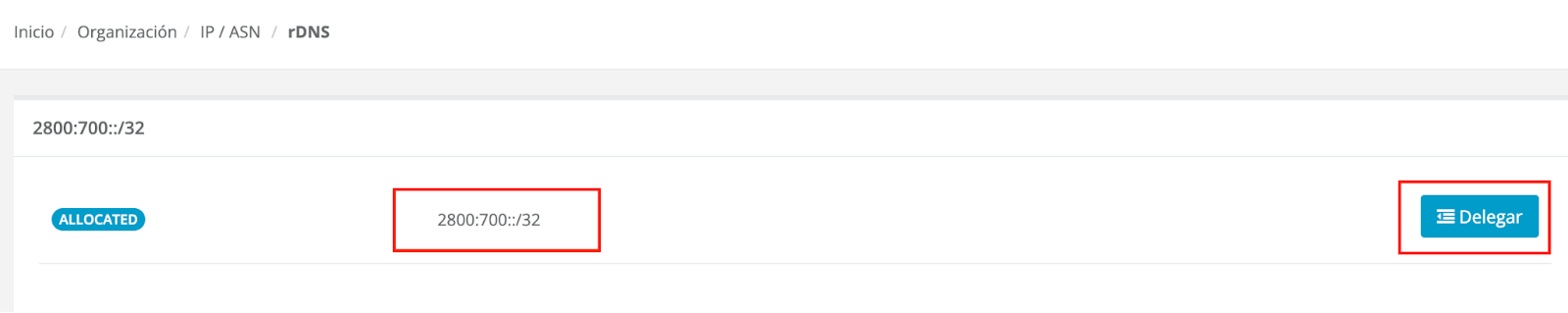 - Botão [Delegar]: com esta ação começa o processo para delegar DNS inversos para o bloco IP selecionado.