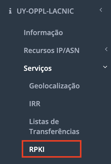 No menu de contexto da organização, selecione a opção [Serviços] / [RPKI], e a partir daí você pode acessar a seção para criar ROAs e administrar os detalhes sobre o RPKI: