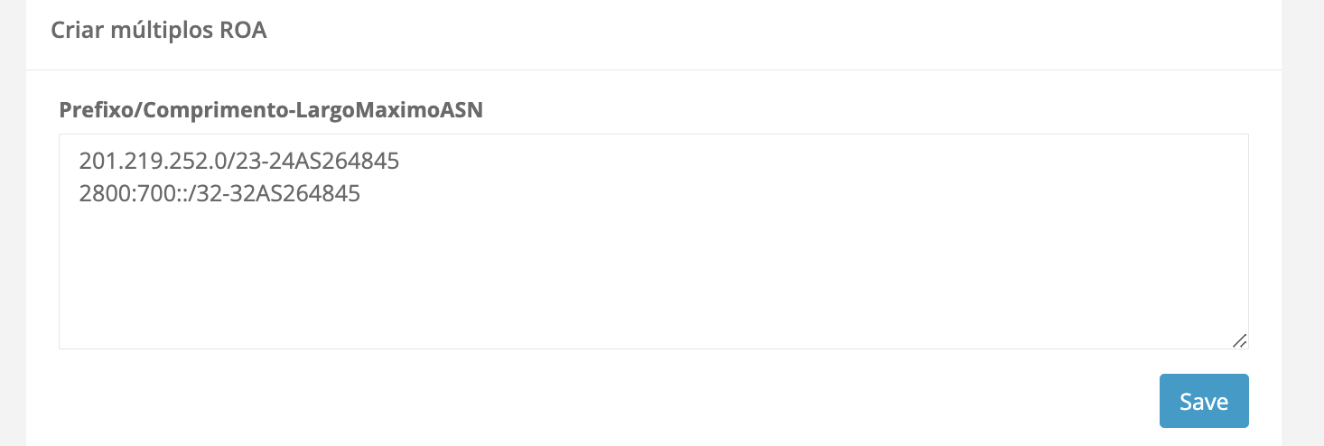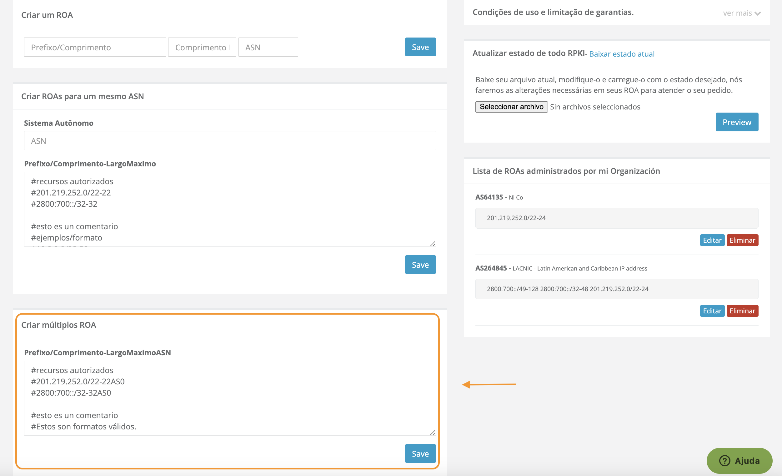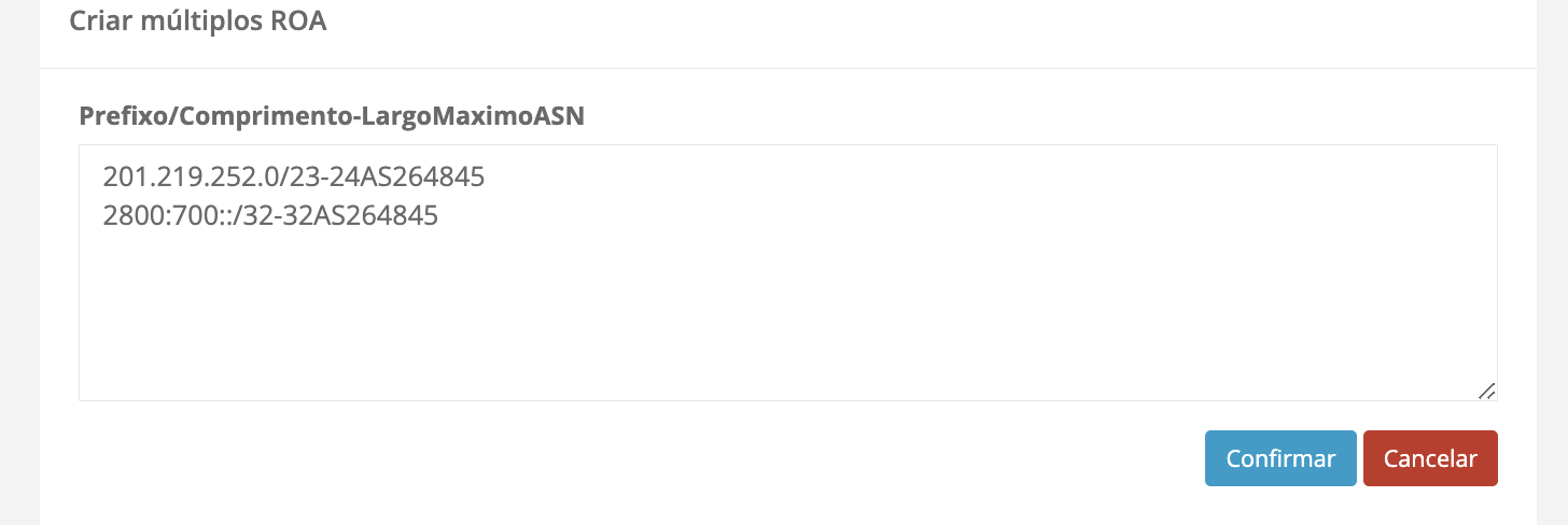 Na seção RPKI, encontrará a interface de criação de ROAs. Lá, você deverá clicar em “Criar múltiplos ROAs”, seção localizada na parte inferior esquerda da interface, onde poderá criar os ROA correspondentes.