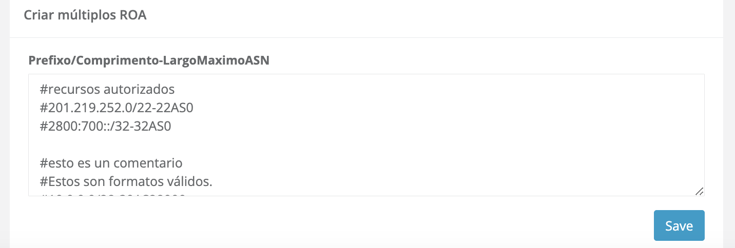 Esta seção fornece informações úteis para gerar ROAs usando esta ferramenta. Todas as sentenças que tiverem # na frente não serão levadas em consideração para o ROA que seja gerado. Também são detalhados os recursos da minha organização para os quais é possível registrar ROAs, bem como exemplos de formatos aceitos.