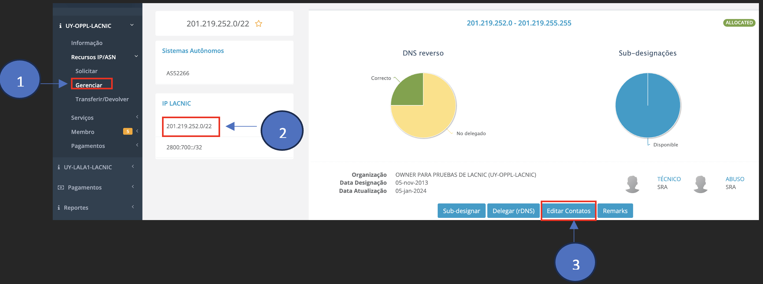 3) Clicar no botão [Editar Contatos] para poder iniciar o processo para editar contatos de Abuso e Técnico para o ASN.