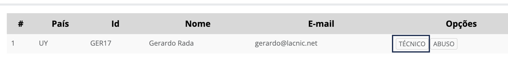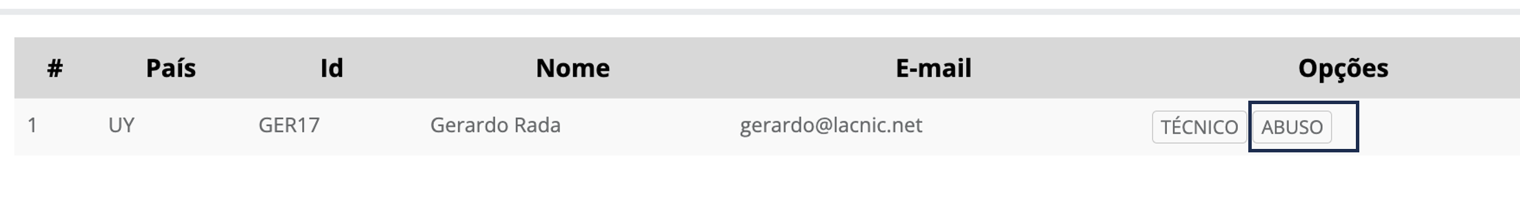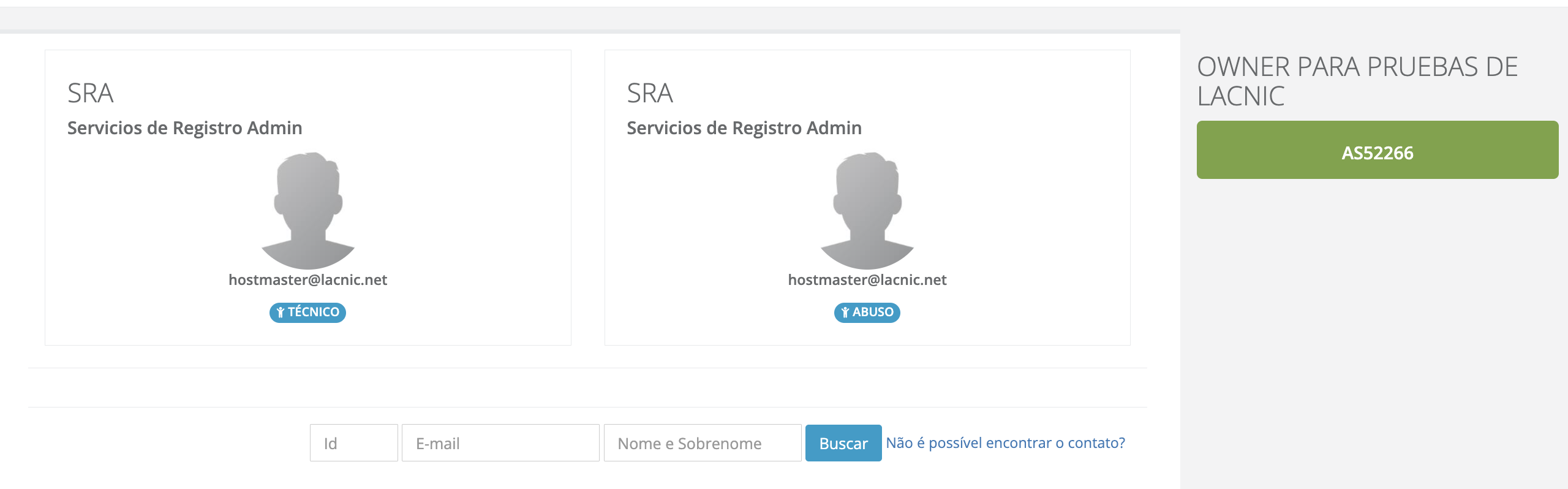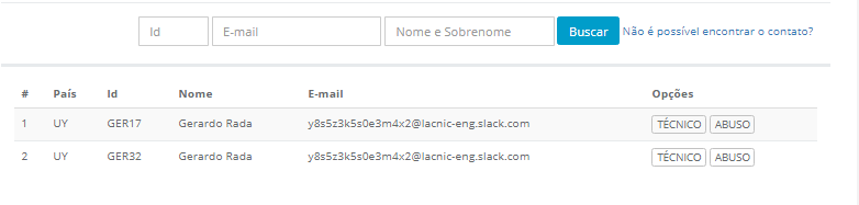 - Com a busca completa, será exibida uma listagem de contatos/usuários que você poderá designar como novos contatos TÉCNICO ou ABUSO para o ASN em edição.