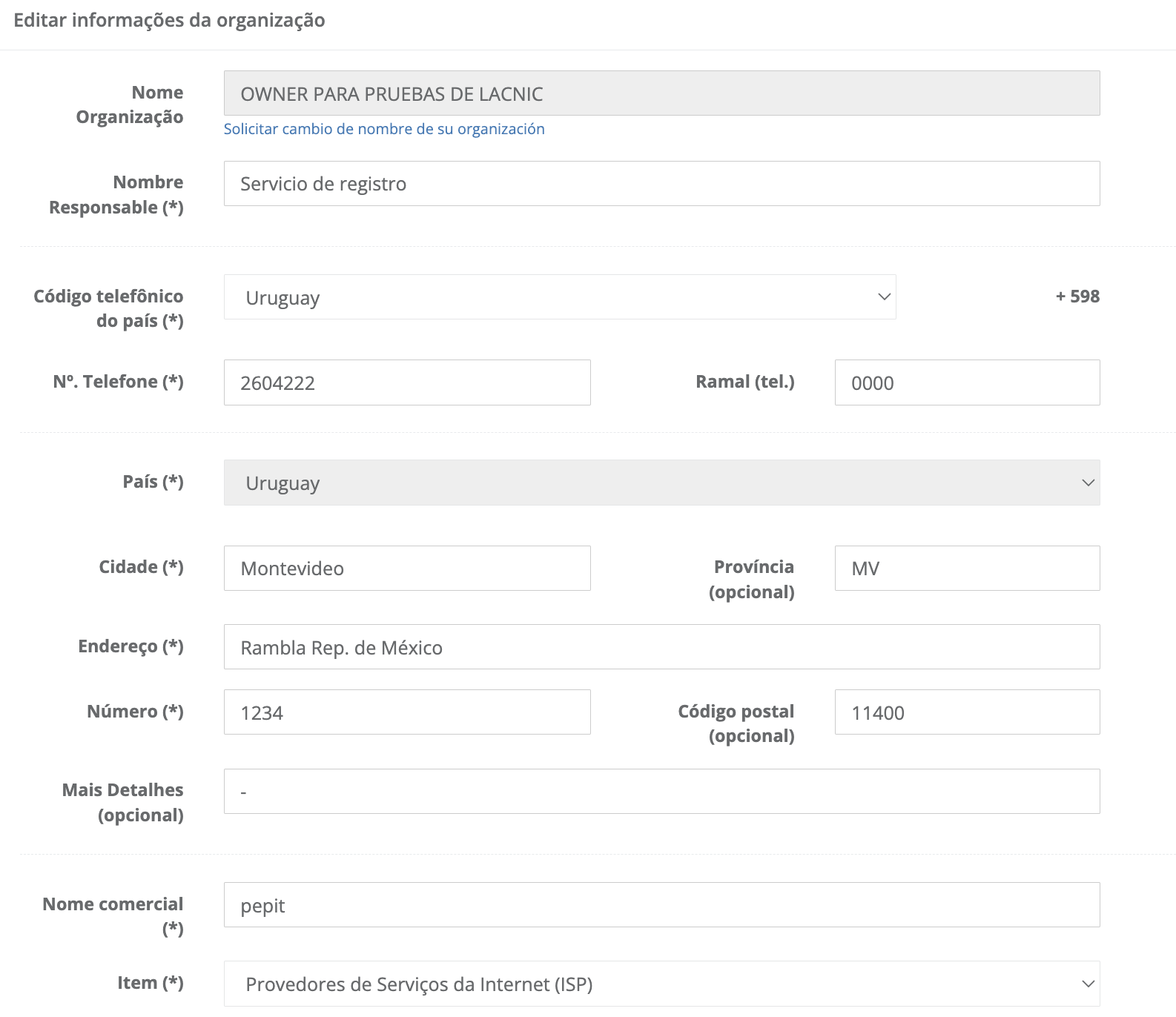 1) Da Organização: Uma vez no detalhe da organização associada ao LACNIC, você encontra o botão [Editar Organización].
