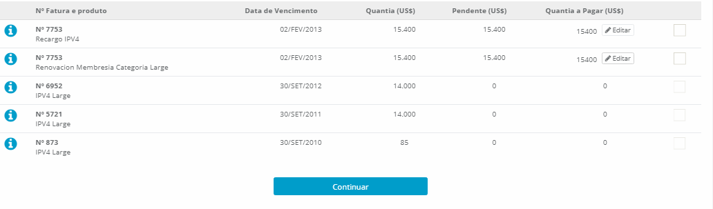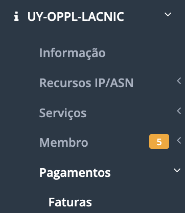 Nesta seção você pode revisar suas faturas emitidas por LACNIC, pode ver aquelas que estão pendentes de pagamento, bem como aquelas que já foram pagas.
