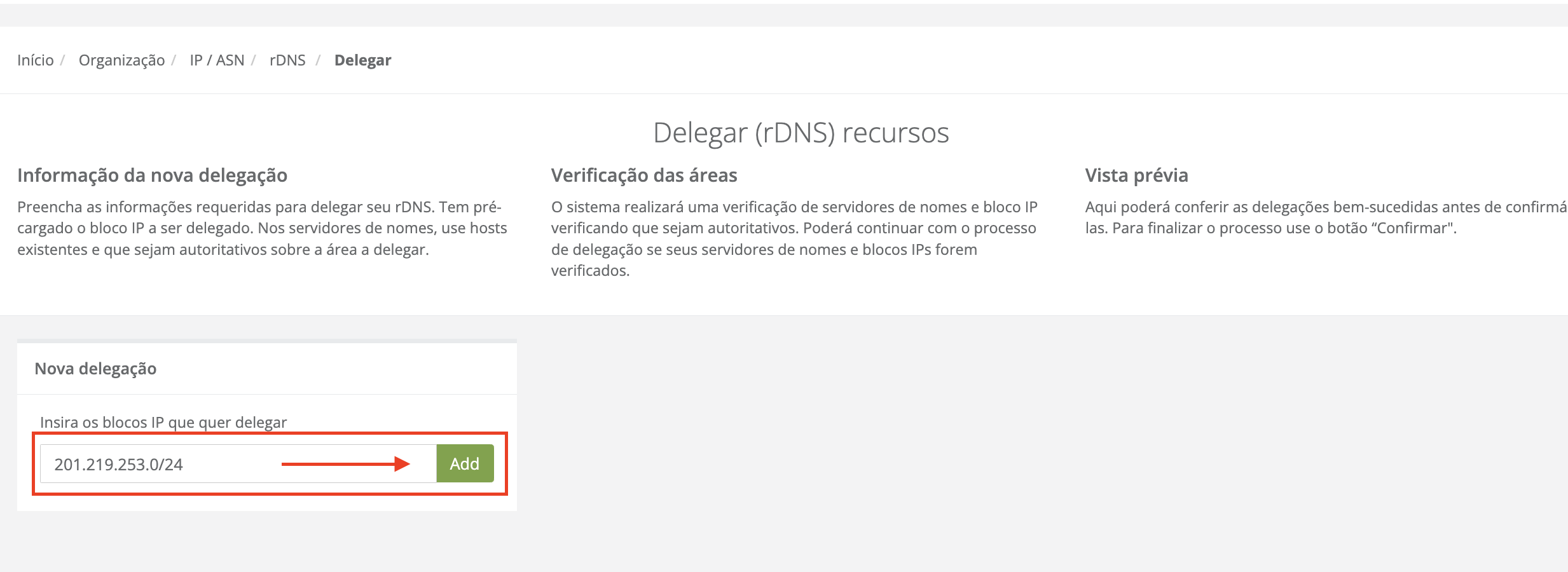 Na primeira seção [Nova delegação] será inserido automaticamente o bloco que foi previamente selecionado ao usar o botão [Delegar]. No entanto, poderá modificar manualmente o bloco e prefixo para o qual deseja registrar o rDNS (deve pertencer ao bloco pai previamente selecionado) e clicar no botão [Adicionar].