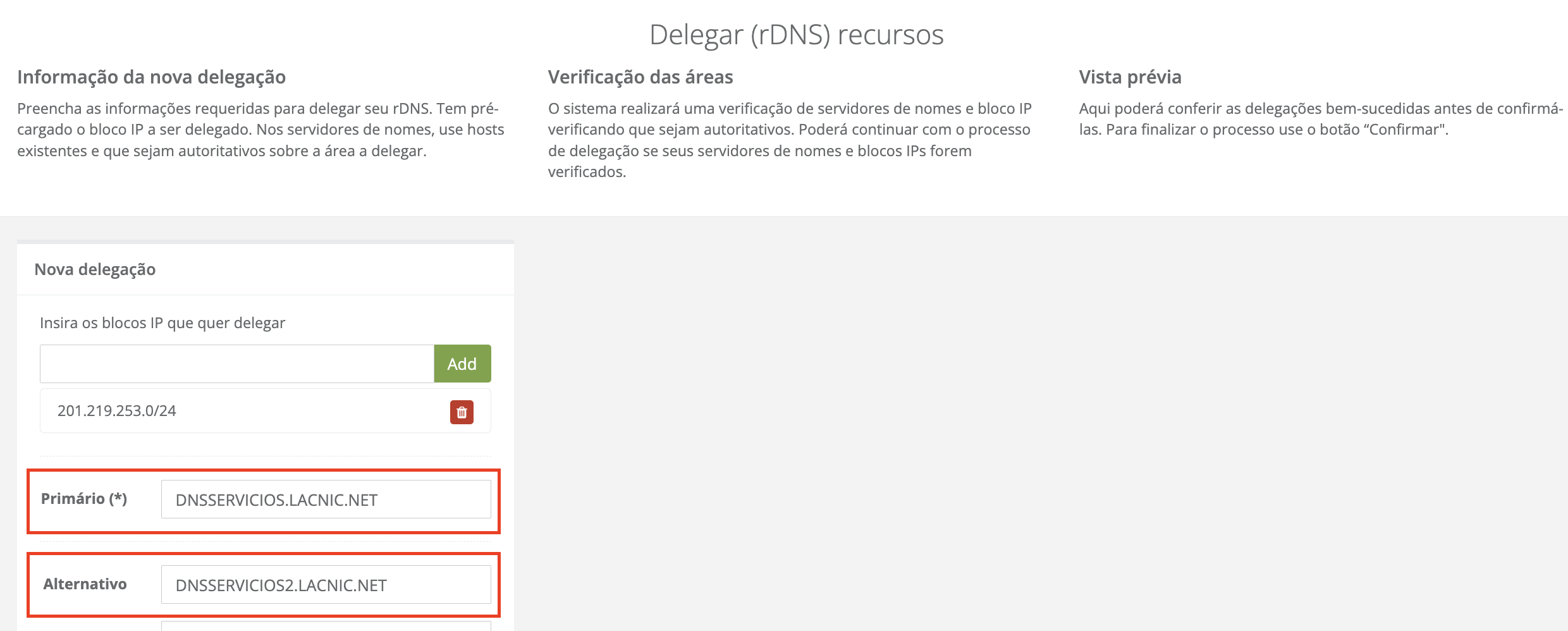 - A última parte do processo de delegação de DNS inversos mostra um resumo com todos os dados que você acabou de processar, que serão confirmados após a conclusão do processo. São: